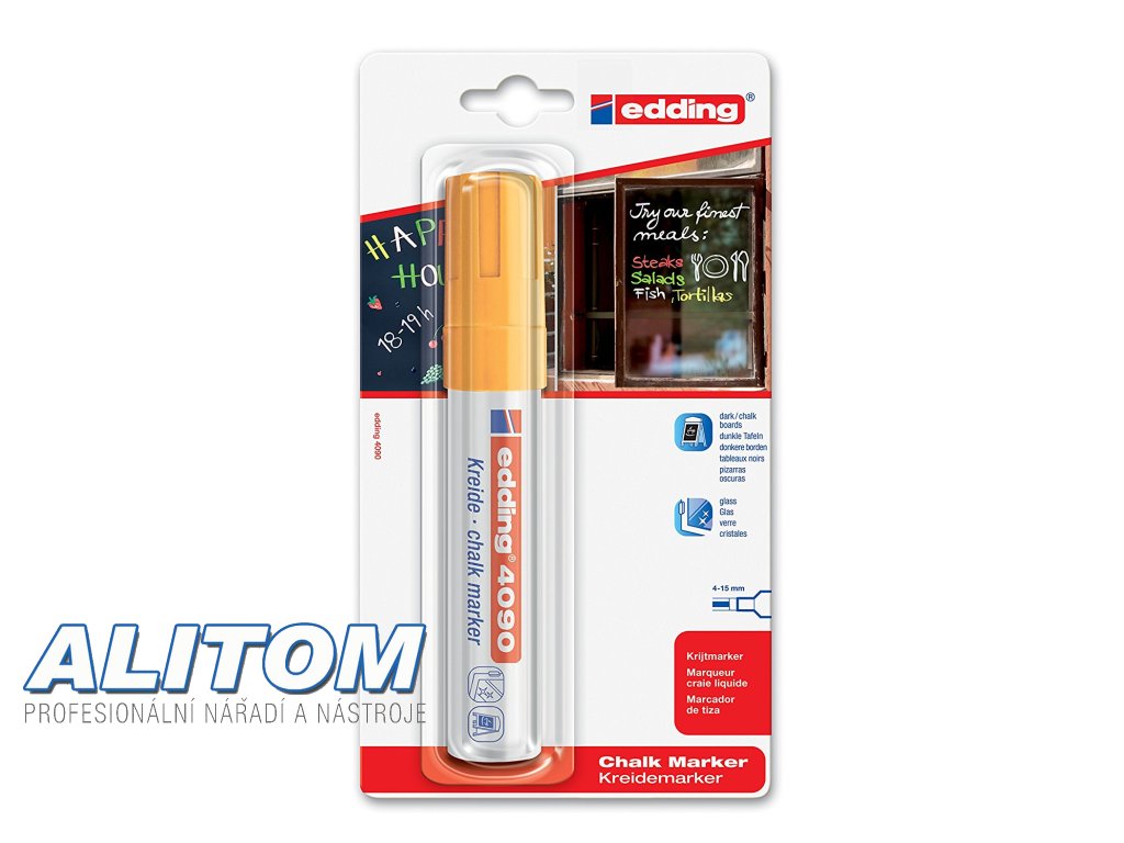 Popisovač na okna Edding 4090 je vybaven seříznutým hrotem. Popisovač obsahuje tekutou křídu bez zápachu na bázi vody. Stopa je smazatelná vlhkým hadrem z téměř všech nepórovitých povrchů.
